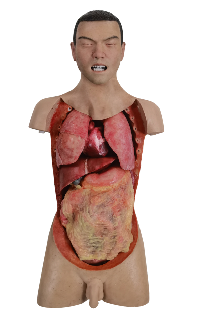 The simulator displays the realistic thoracic and abdominal organ structures and allows for adjusting cardiovascular pulsation with a wireless blood circulation device. It supports surgical training such as trauma hemostasis and organ repair,, making it suitable for various open surgery simulation training.