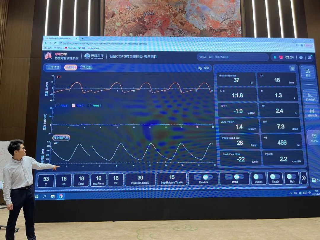 此外,来自中国科学技术大学附属第一医院(安徽省立医院)的金魁主任在讲授主旨为“异常波形分析”的论坛讲座时,使用了星空平台-星空(中国)一站式服务平台“模拟肺”内置的呼吸力学模型——“轻度COPD有自主呼吸 老年男性”,帮助参会学员更好的理解存在肺部疾病患者机械通气时通气波形的特点及监测参数异常改变。金魁主任对“模拟肺”给予了高度肯定,并建议学员课后有时间都可以进行实操训练。